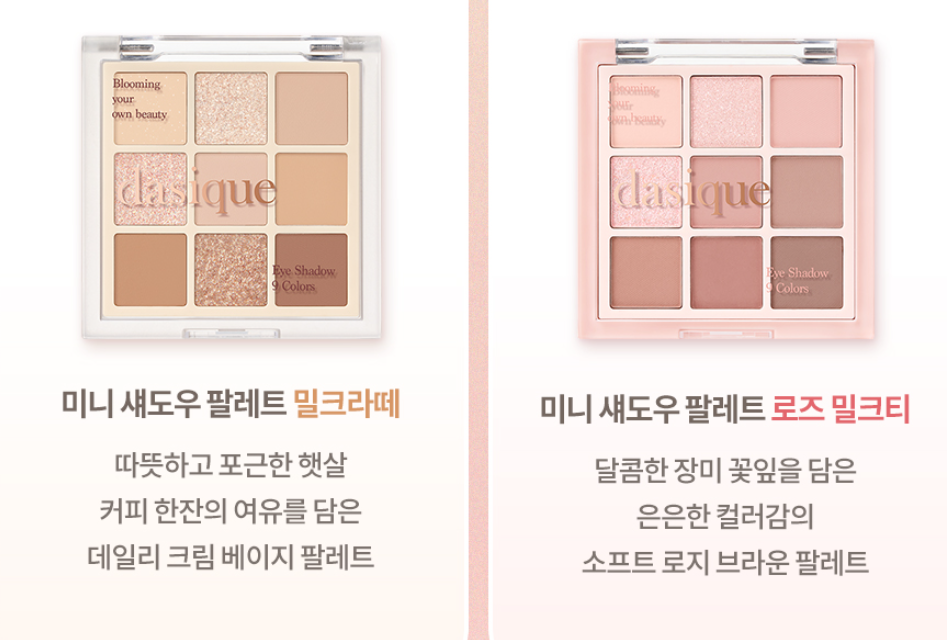 이번 이벤트에서는 데이지크의 인기 아이템인 미니 섀도우 팔레트가 특별한 할인 혜택으로 제공되는데요. 밀크 라떼와 로즈 밀크티 두 가지 컬러 옵션으로 구성된 미니 섀도우 팔레트는 휴대하기에도 부담 없고, 데일리 메이크업에 최적의 사이즈로 출시되어 많은 분들의 관심을 받고 있어요.