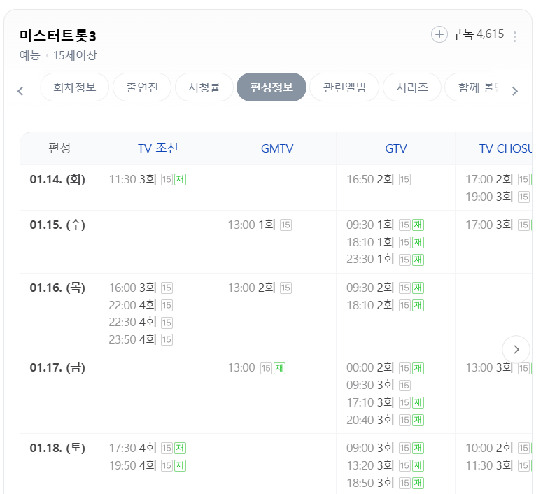 ‘미스터트롯3’는 본방송 이후 다양한 시간대에 재방송됩니다.