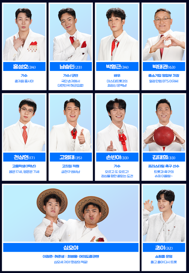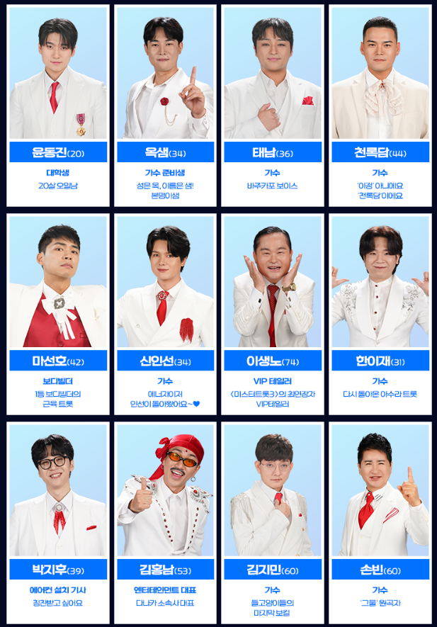 - 박태관: ‘BTS 아저씨’로 알려진 친근한 이미지와 감동적인 트로트 무대로 기대를 모으는 참가자