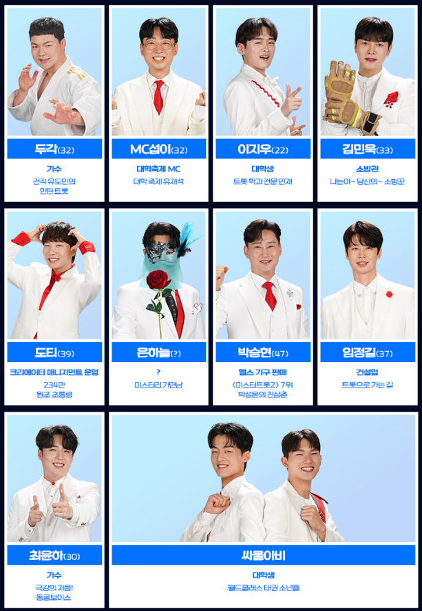 - 이후림: 뮤지컬 배우 출신으로 카리스마 넘치는 무대 퍼포먼스와 대중적 감성을 겸비한 참가자