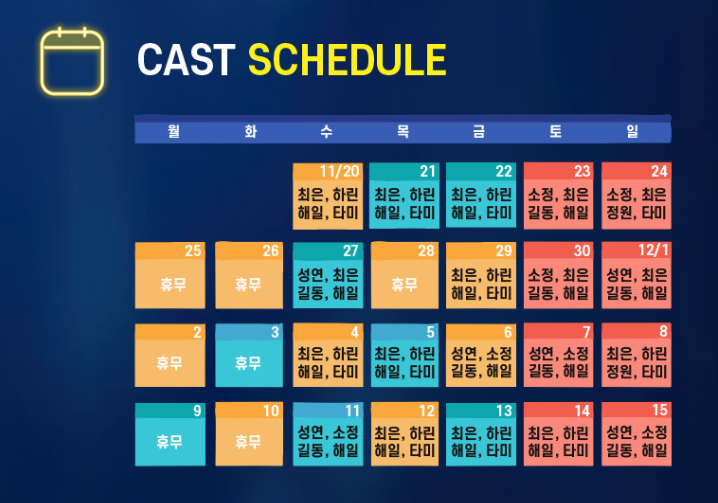 금요일: 오후 4시, 7시 - 장소: 대학로 스타시티 6층