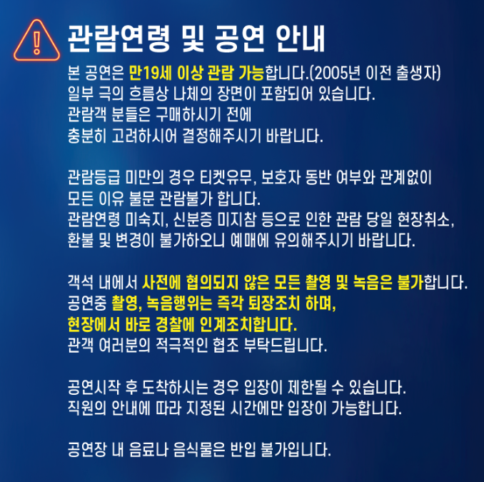 - 19세 이상만 관람 가능한 성인 연극이므로 입장 시 신분증을 꼭 지참하세요.