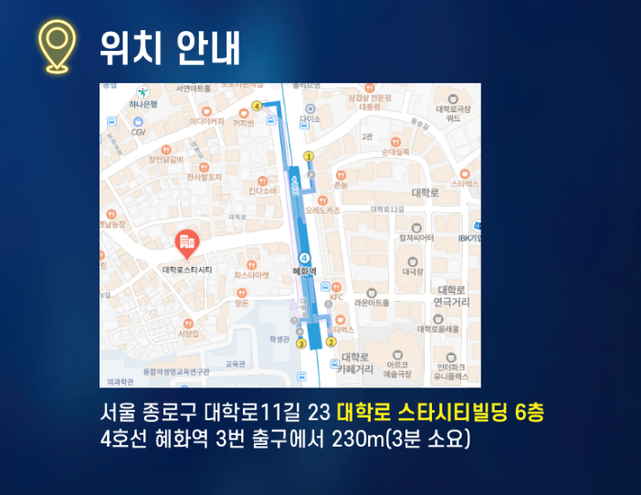 - 대학로 스타시티 6층 (혜화역 1번 출구 도보 5분 거리)