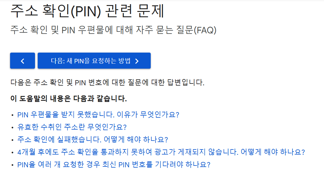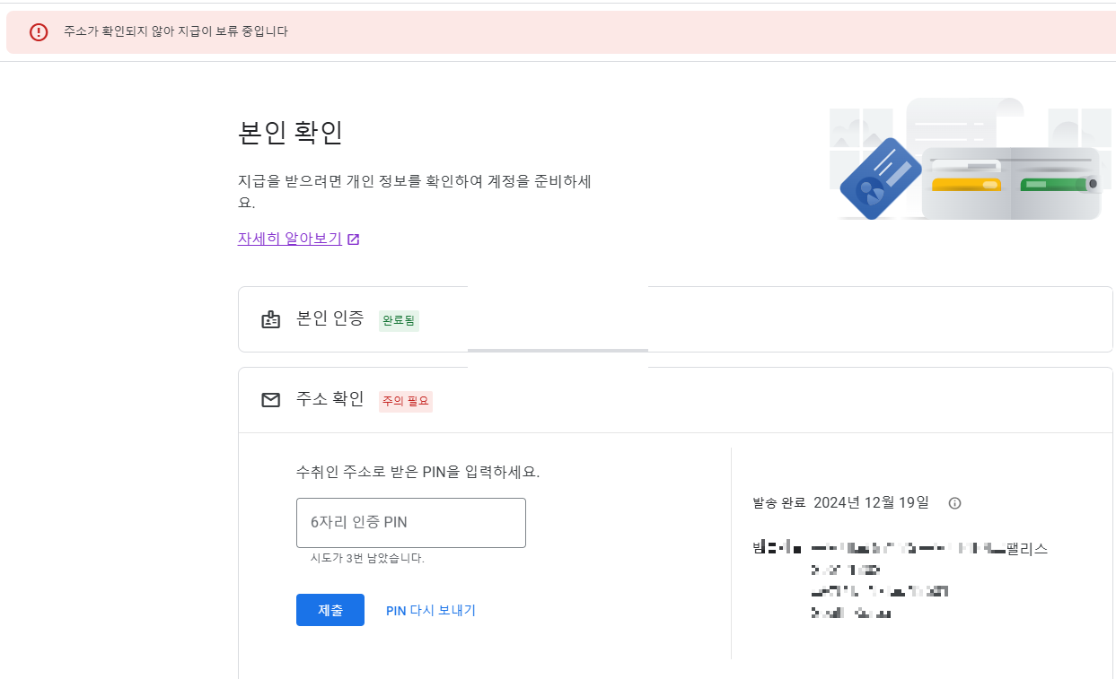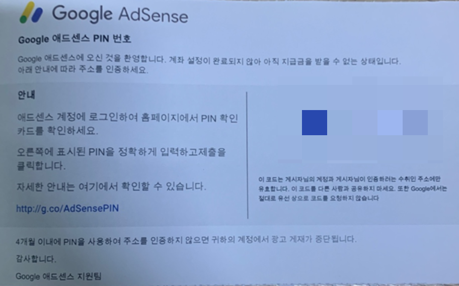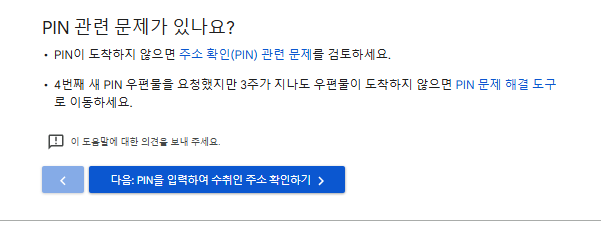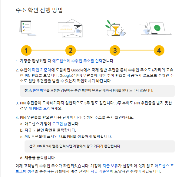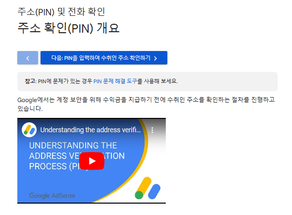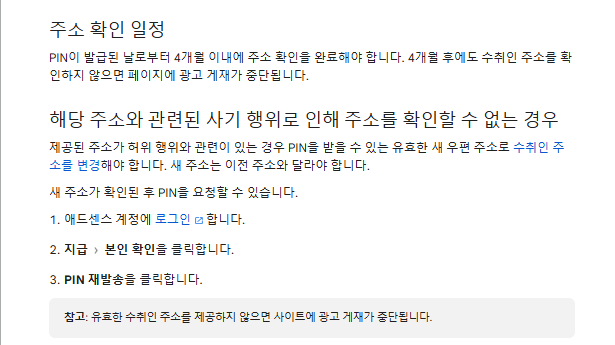 주소 인증이 완료되지 않으면 애드센스 수익 지급이 보류되기 때문에 반드시 PIN 번호 인증을 완료해야 합니다.