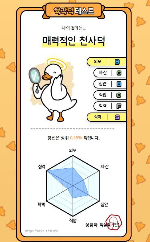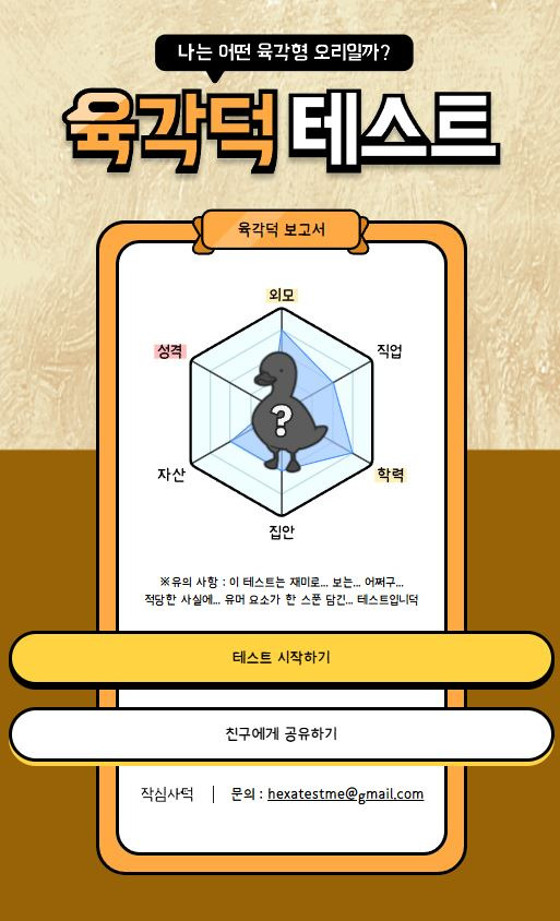 👉 인터넷에서 "육각덕 테스트"를 검색하거나, 위 링크를 통해 공식 사이트에서 참여할 수 있습니다.