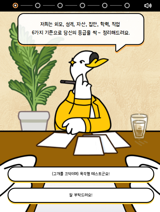 👉 6가지 항목(소비 습관, 직업, 학력, 재산, 성격, 외모)을 종합하여, 나의 덕질 스타일이 분석된 결과가 나옵니다.