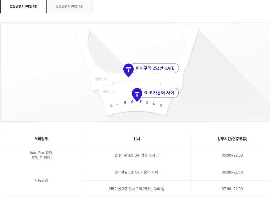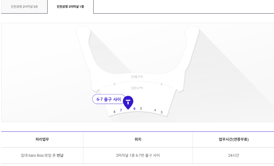 - 입국장 로밍센터 (4번 출구 옆): 오전 6시 ~ 오후 10시