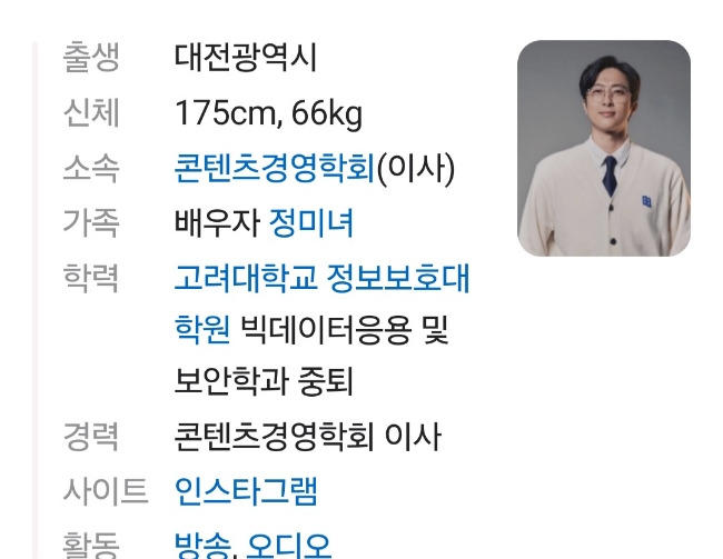 - 학력: 세종대학교 학사, 고려대학교 정보보호 대학원 (중퇴)