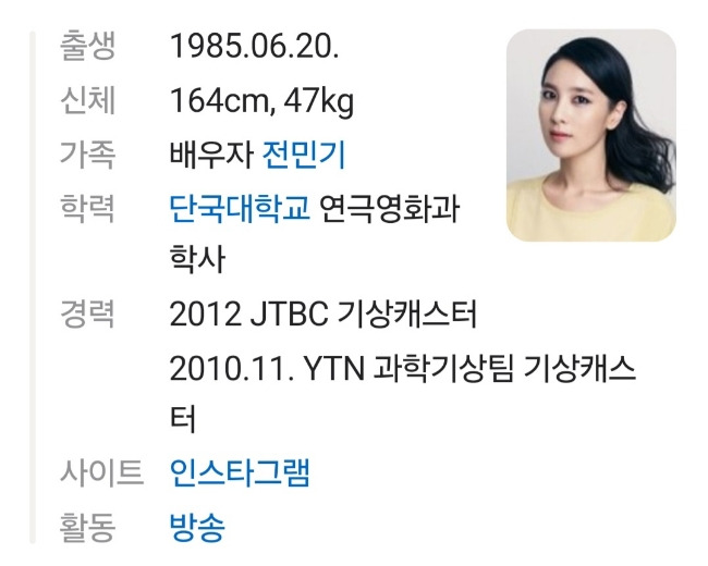 - 직업: 방송인, 쇼호스트, 전직 기상캐스터