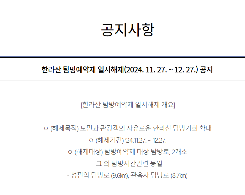 한라산 탐방 관련 문의는 제주특별자치도 국립공원 관리소에서 확인 가능합니다.