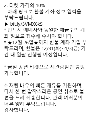 - 결제 수단에 따라 환불 절차가 상이할 수 있으니 예매처를 통해 확인 필수