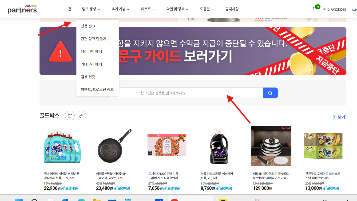 상품 검색: 쿠팡 파트너스 홈페이지에서 홍보하고자 하는 상품을 검색합니다.