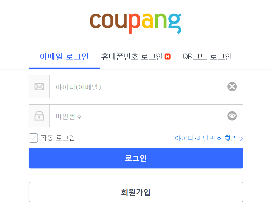회원가입 진행: 오른쪽 상단의 '회원가입' 버튼을 클릭합니다. 기존 쿠팡 아이디가 있다면 이를 활용하여 로그인할 수 있으며, 없다면 새로운 아이디를 생성합니다.