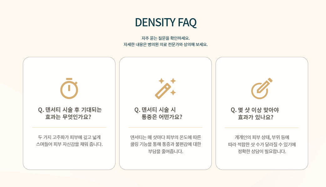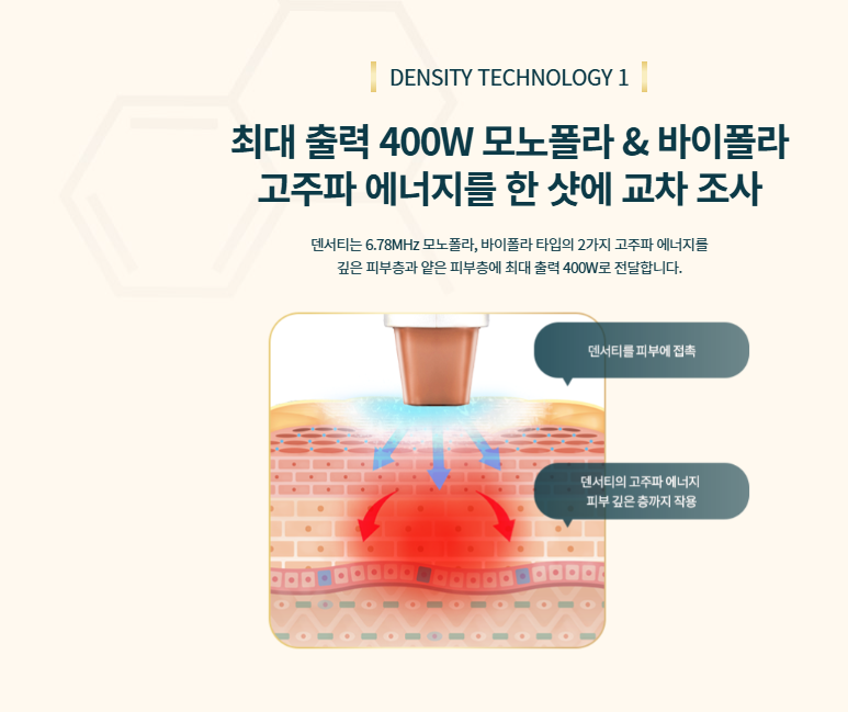 덴서티는 피부 내부의 물 분자와 이온이 진동하면서 발생하는 마찰열로 특정 조직을 자극하는데요. 이를 통해 피부 속부터 개선되는 느낌을 받을 수 있습니다. 다만, 개인에 따라 효과는 차이가 있을 수 있습니다.