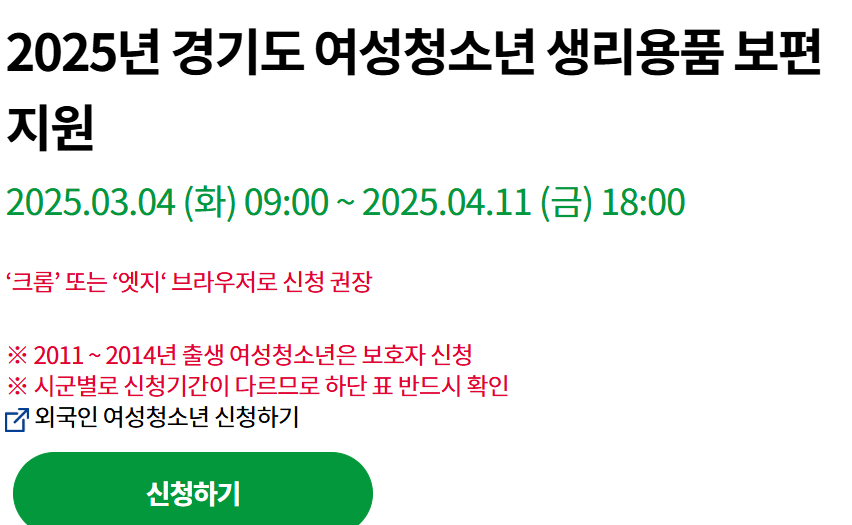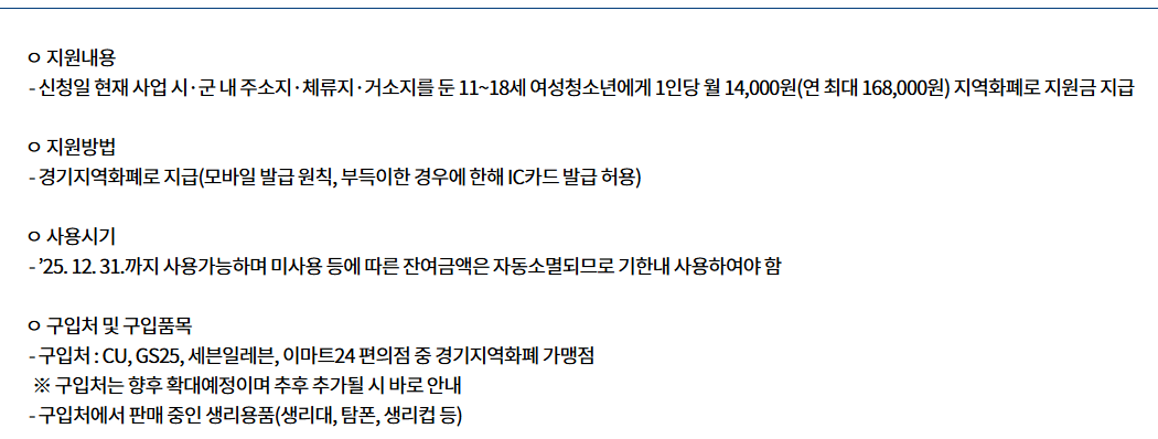 ✅ 이번 경기도 생리대 지원으로 많은 여성청소년들이 건강하고 당당한 삶을 누릴 수 있길 바랍니다. 꼭 신청하시고, 주변에도 널리 알려주세요!