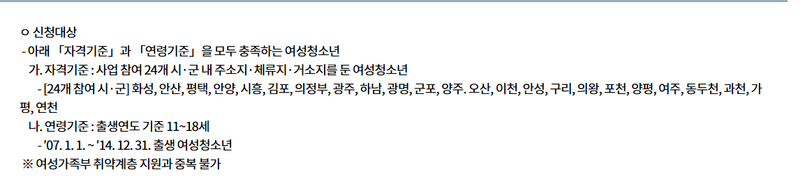 - 경기도 24개 참여 시·군 내 주소지, 체류지, 거소지를 둔 11~18세 여성청소년 (2007. 1. 1.~2014. 12. 31. 출생자)